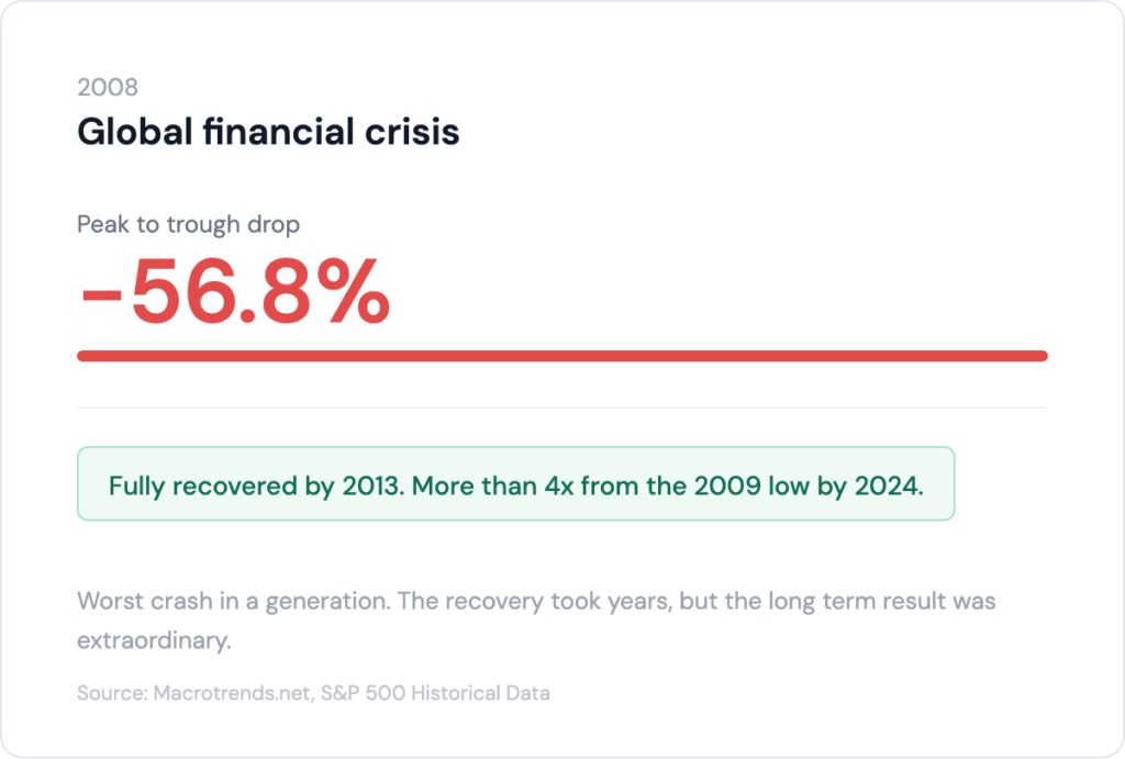 The worst crash in a generation. Markets fell nearly 57% from peak to trough. By 2013 they had fully recovered. By 2024, they had more than quadrupled from the 2009 low.