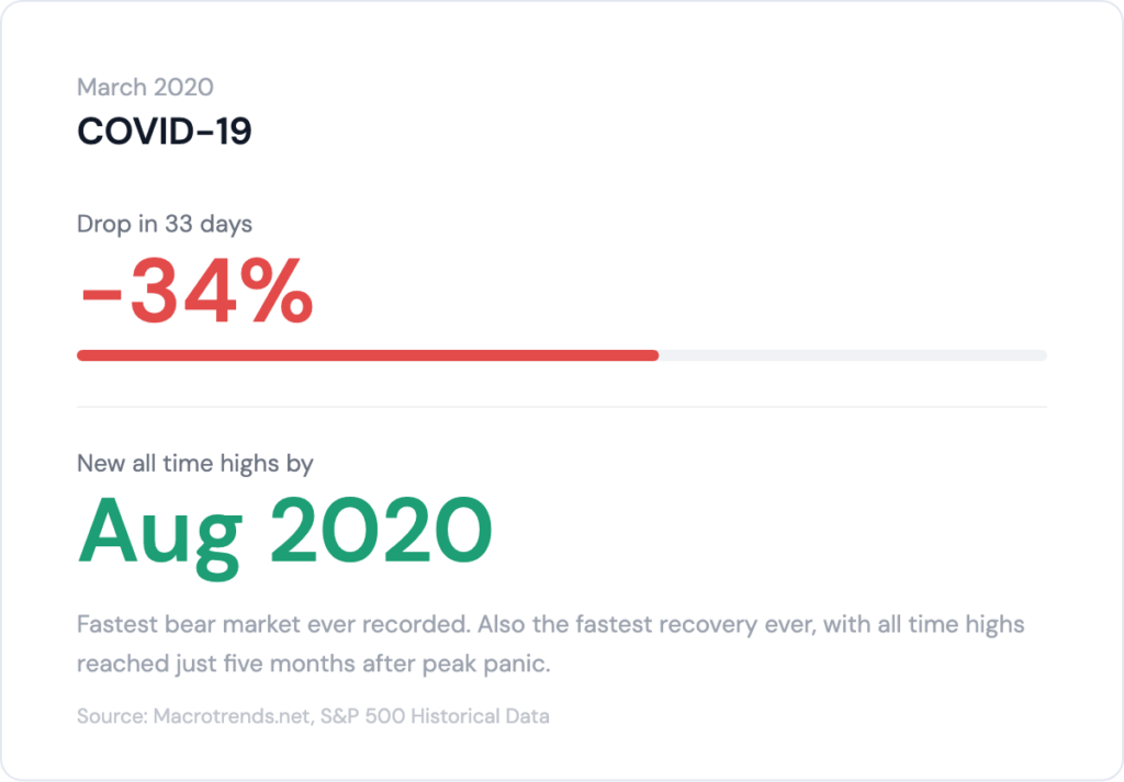 A 34% drop in 33 days. The fastest bear market ever recorded. Also the fastest recovery ever. New all-time highs by August of the same year.